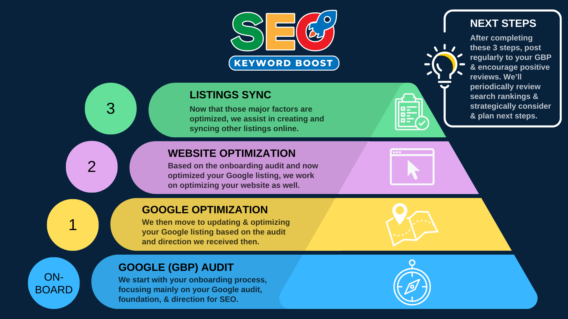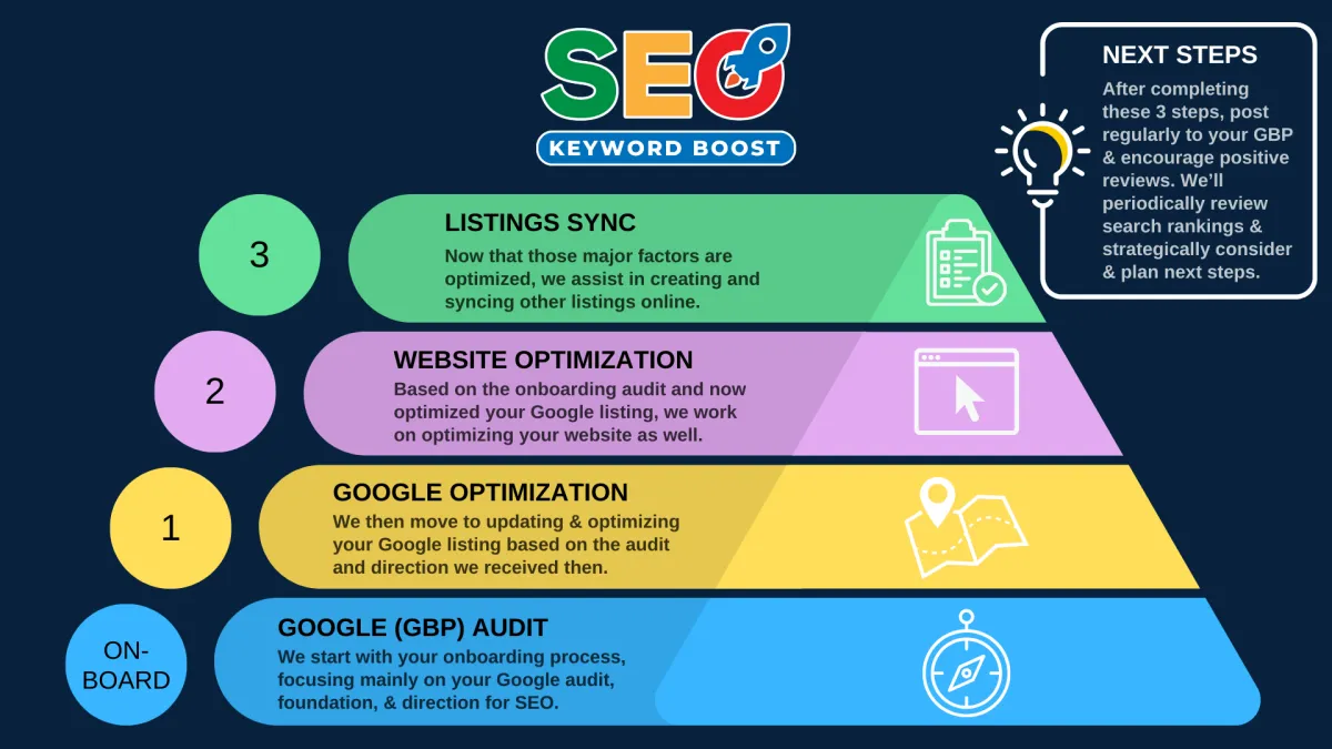SEO (search engine optimization) is not a magic wand to be waved for instant results; it is a process involving algorithms, coding, content, and hard work. To put it simply, SEO is not magic; it's math. That being said, we want you to know as much about the process as possible. In the infographic below, you will see the first 3 steps and then the "Next Steps" section will show you an idea of how we SEO work beyond them. In that section, we also give you some great steps that you can do to continue to help this process as well. We hope you find this helpful.